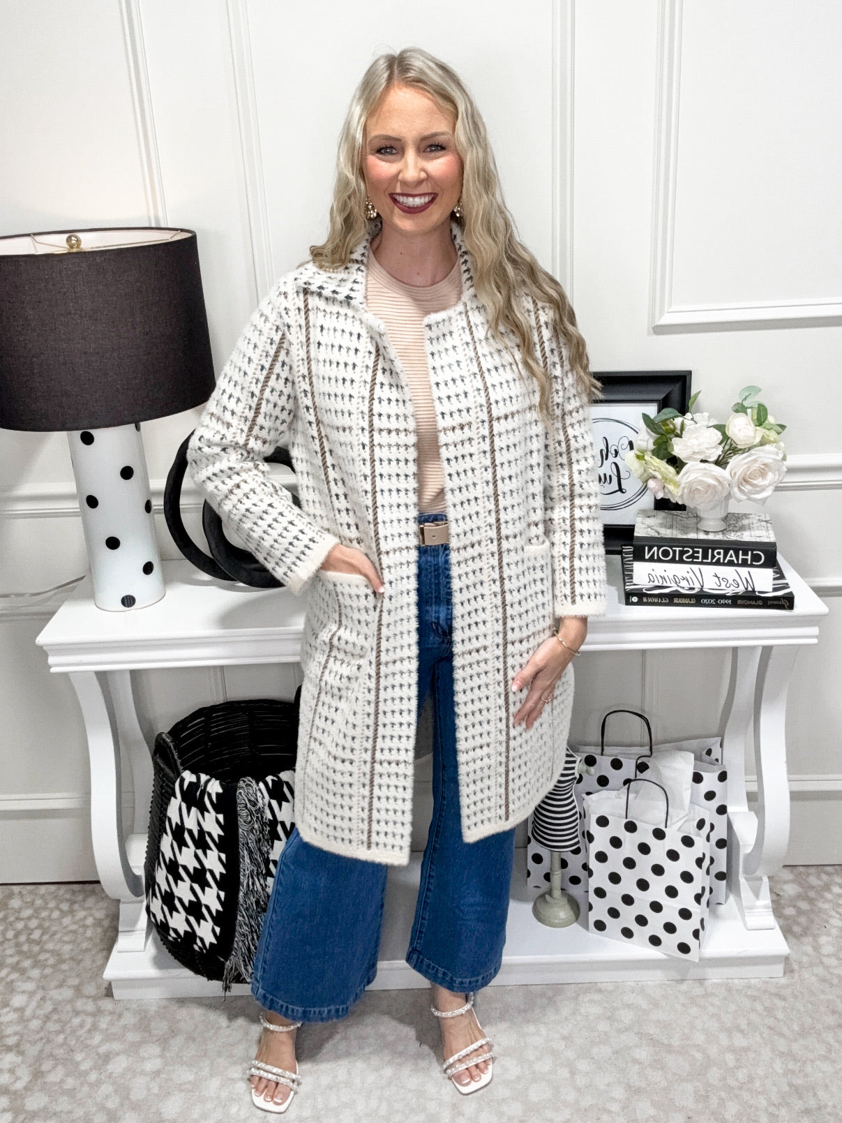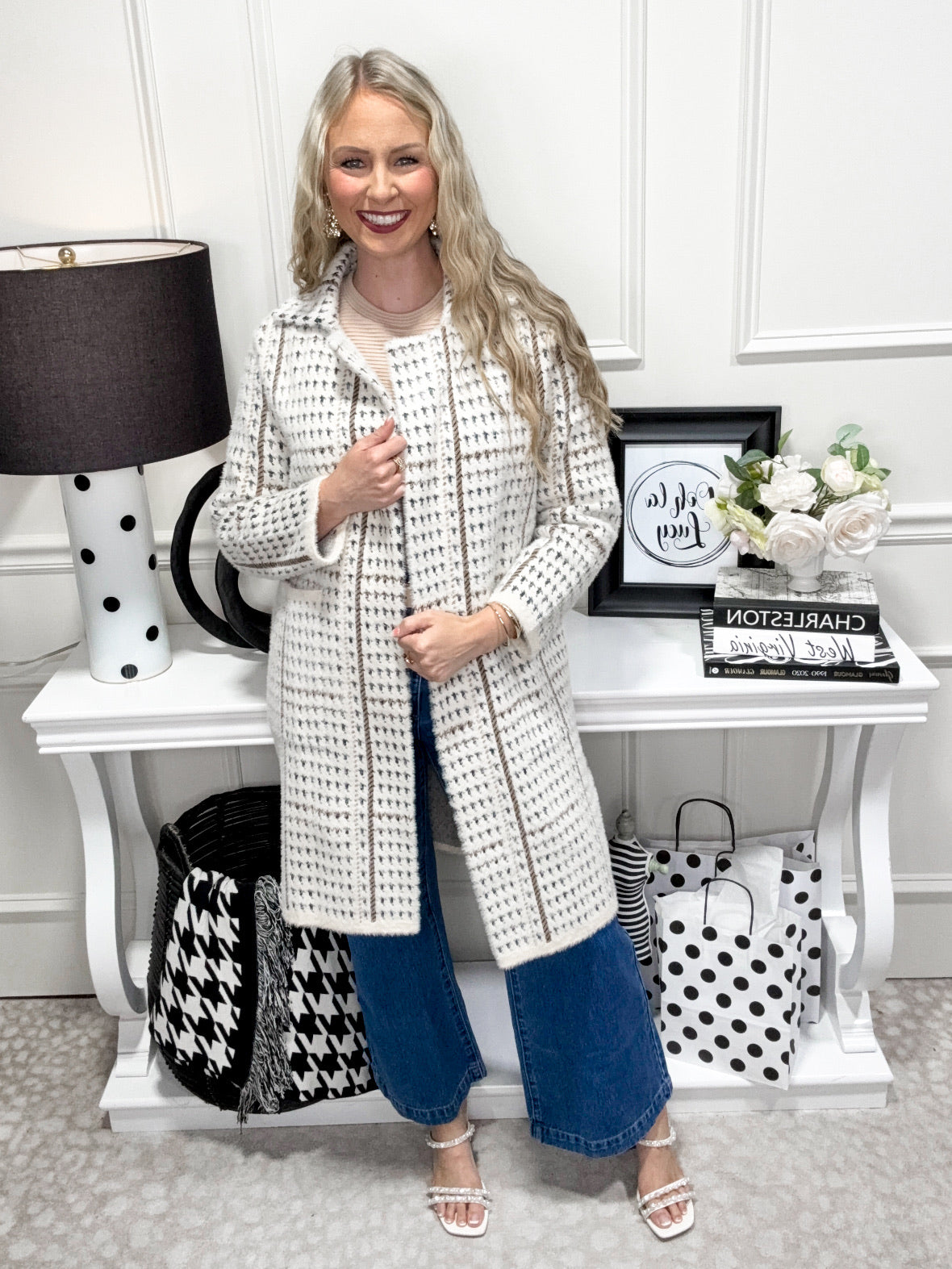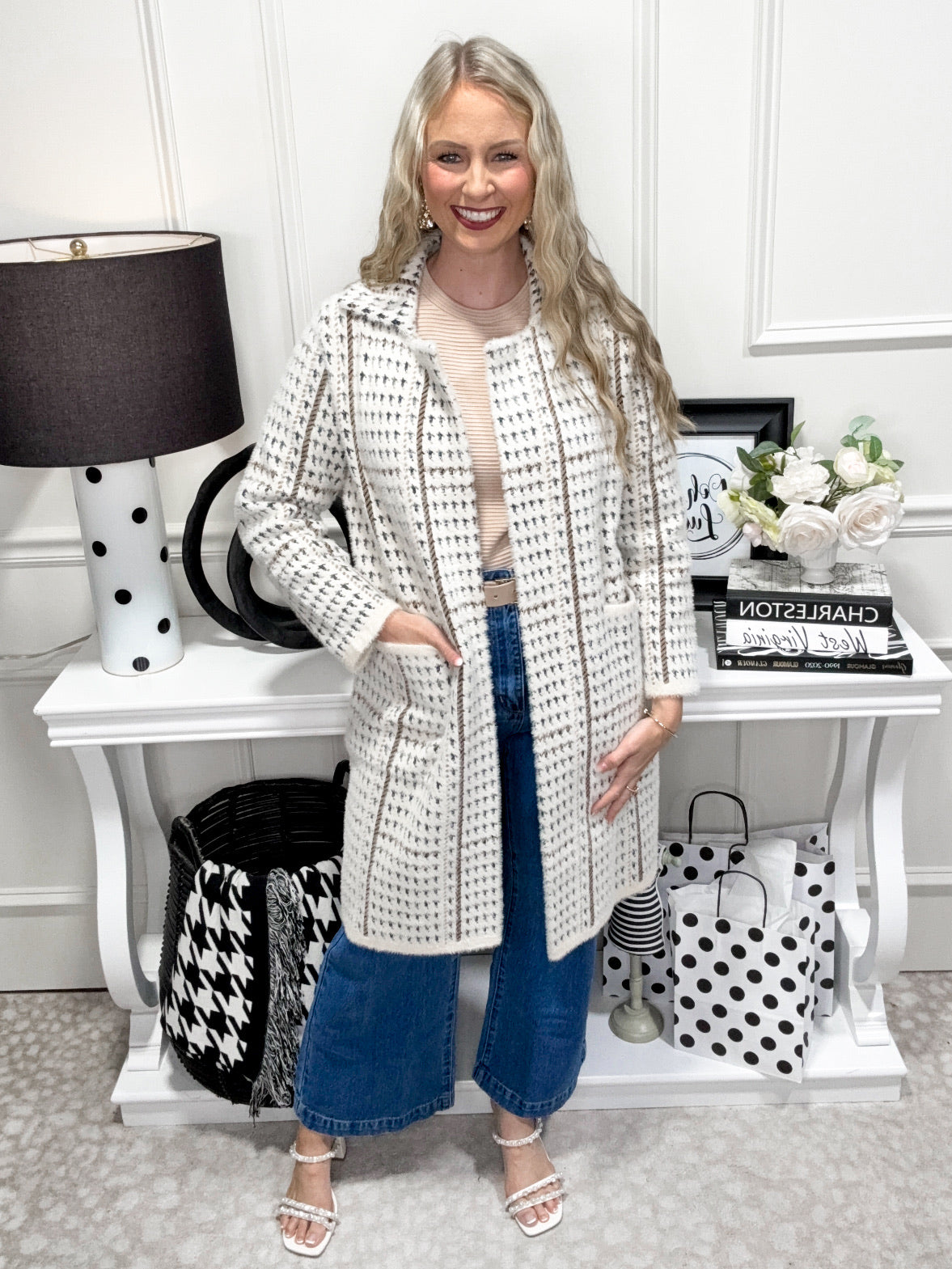 Step into cozy chic with the Poppy Coat! Featuring a timeless houndstooth pattern in neutral shades, this comfy, pocket-friendly coat is your perfect partner for crisp fall days and chilly winter nights. Effortlessly stylish and ready to keep you warm, it’s the playful twist your wardrobe has been waiting for.