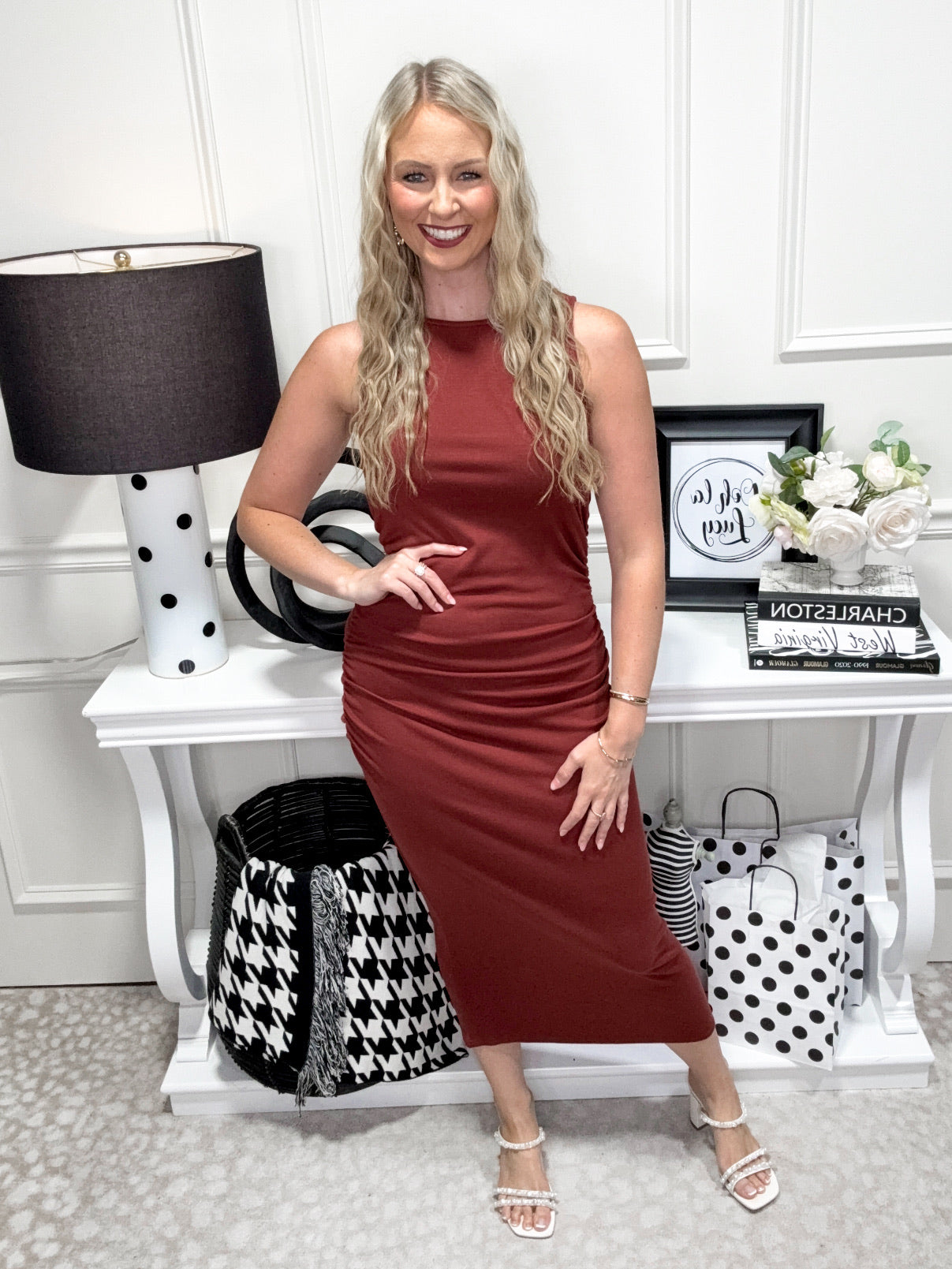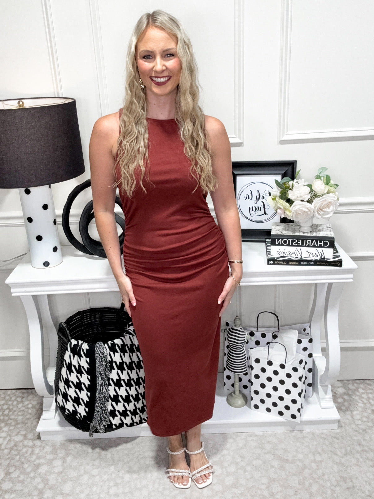 The Ramona Dress in a stunning marsala hue is your new fall favorite. Its playful ruched detail and sleeveless high neck create a chic silhouette that's perfect for layering or wearing solo. Cozy up your look with cardigans or jackets, and enjoy effortless style all season long.