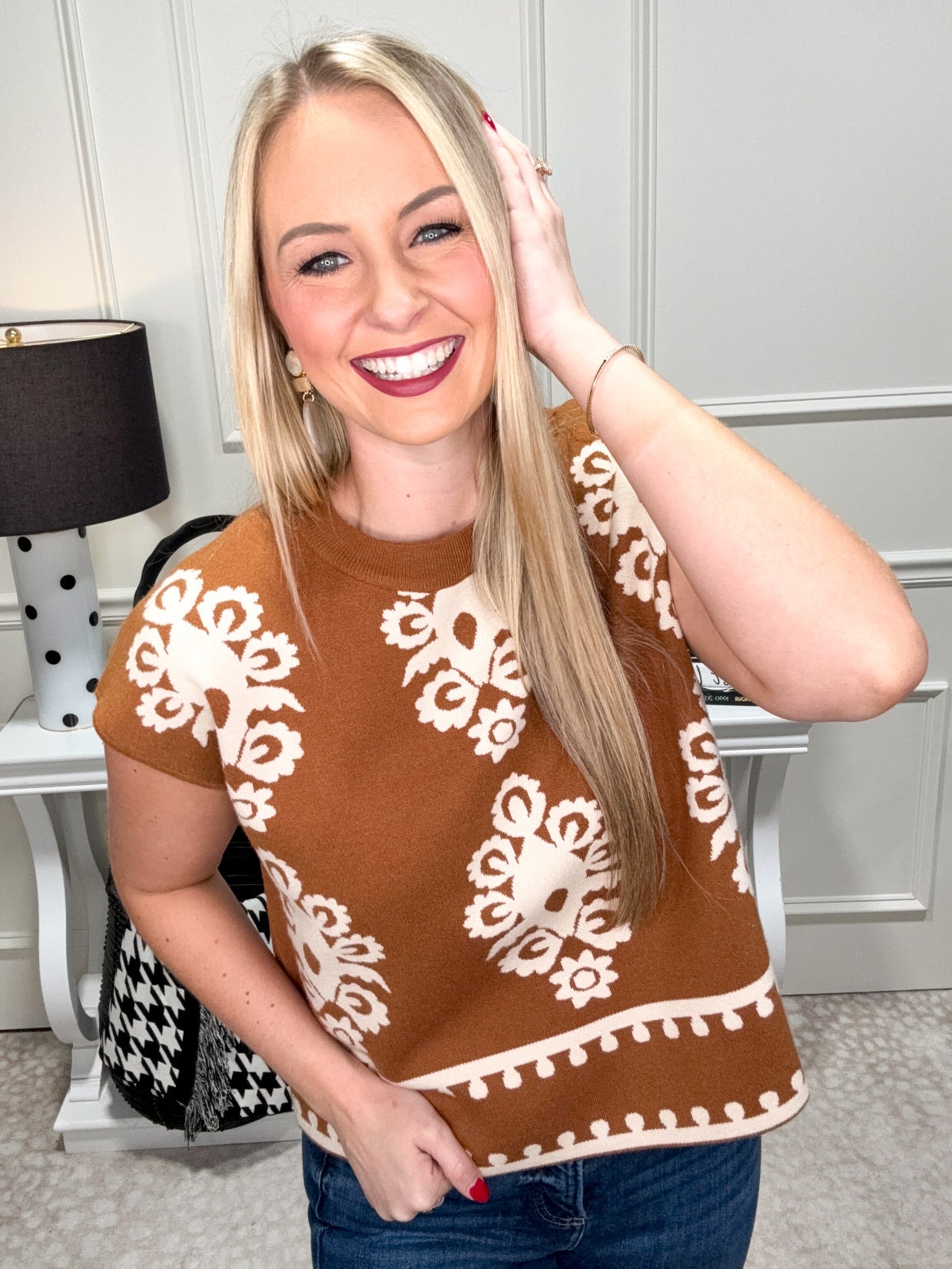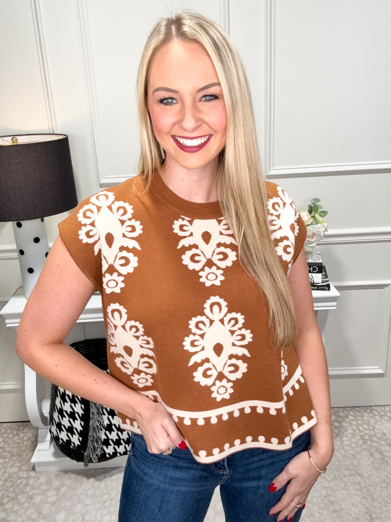 This playful Amara Sweater Top features a chic damask pattern in a cozy, medium-weight knit perfect for layering. Its muscle tee silhouette adds a flirty edge while keeping you comfortable with a non-sheer, unlined design. The rich brown hue brings warmth and style to any outfit, making it a must-have for endless cozy-cool looks.