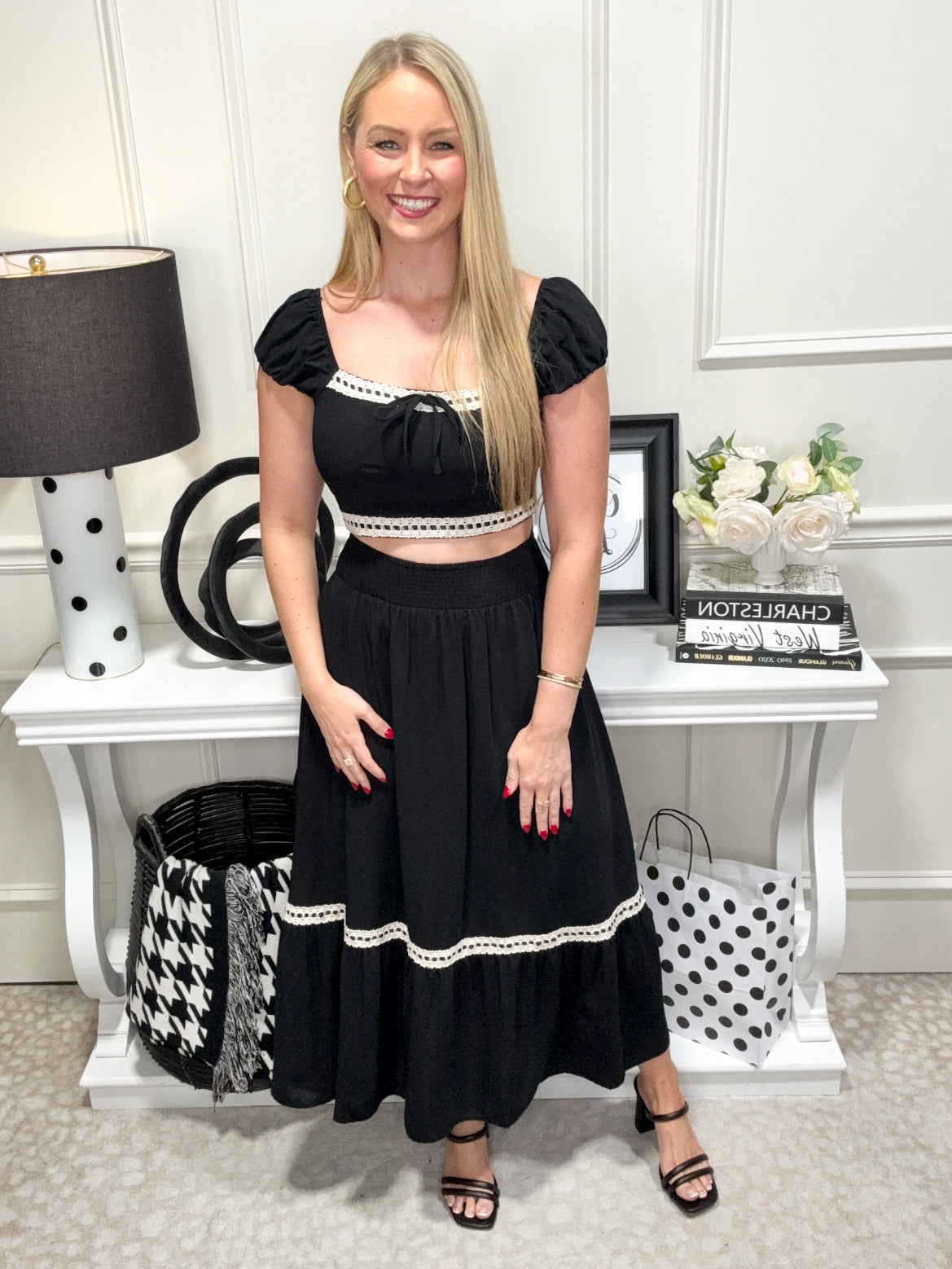 The Hadley Skirt combines comfort and charm with its high-waist design and smocked elastic waistband for a perfect fit. Playful contrast lace trim with a delicate ribbon adds a touch of whimsy, while the ruffle hem enhances its flirty A-line silhouette. Fully lined for comfort, this midi skirt is ready to bring fun and flair to any outfit.