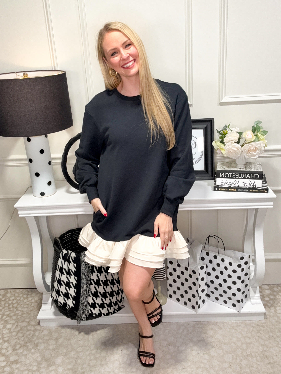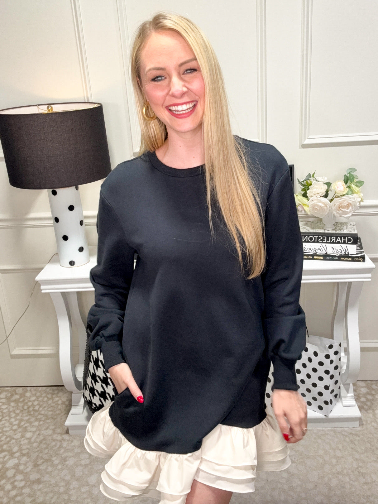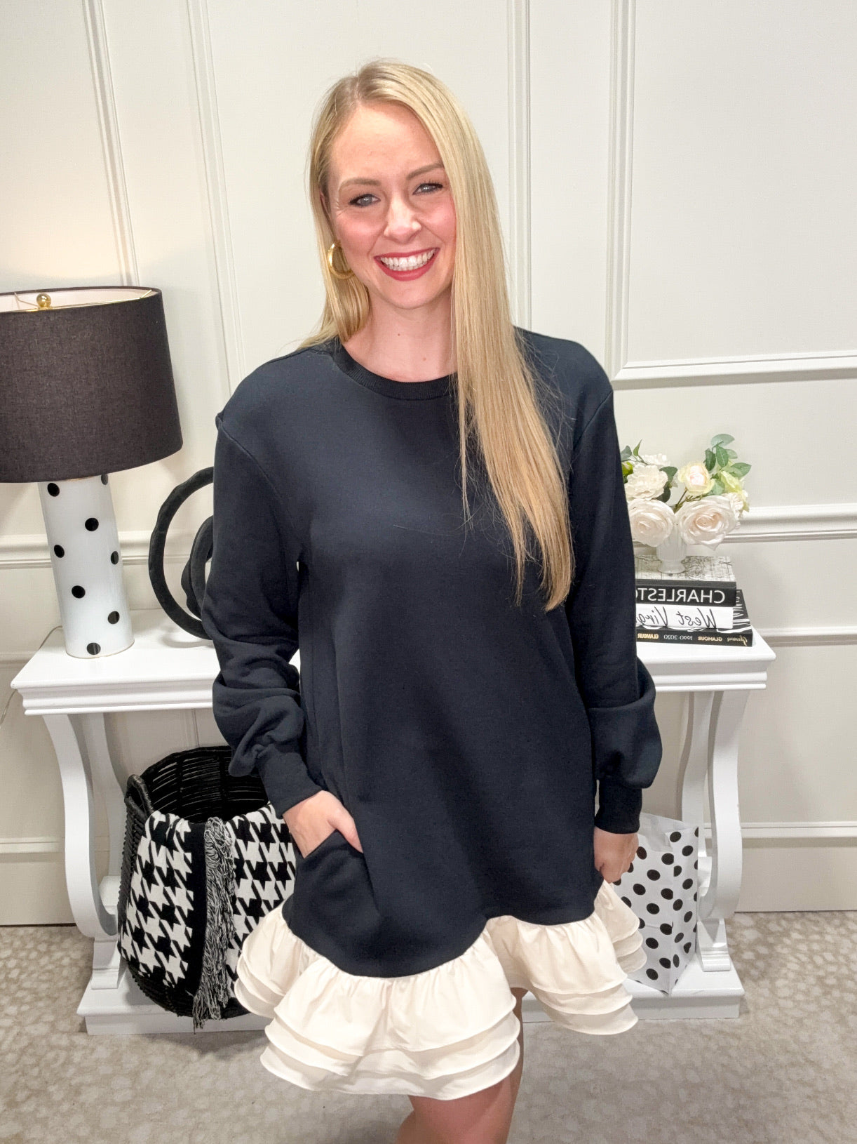The Isabelle Dress combines comfort and style with its unique mix of stretch knit and satin poplin fabrics. This relaxed-fit mini dress features a playful tiered ruffle hem in silky satin poplin that adds twirl-worthy movement. Long sleeves with ribbed cuffs and a ribbed round neckline keep the look cozy, while convenient side pockets add a fun, practical touch. Perfect for those who love effortless style with a flirty twist.