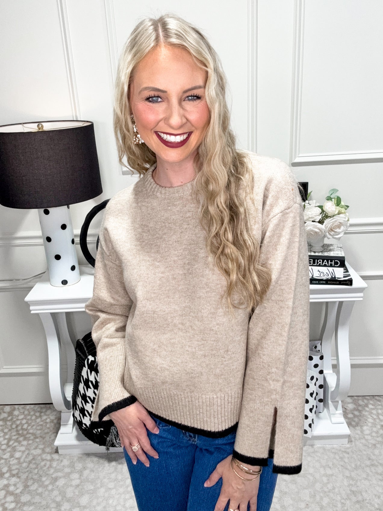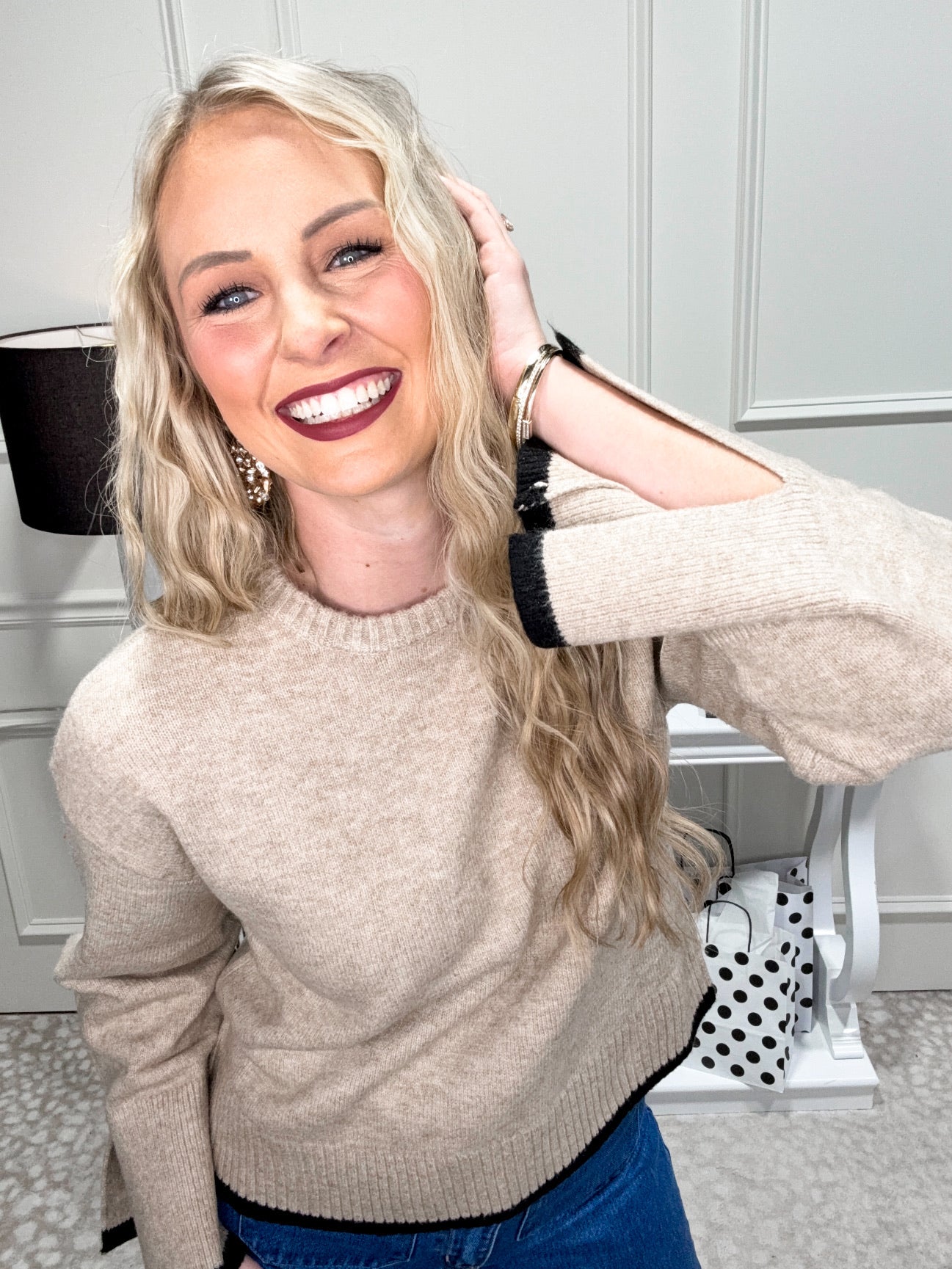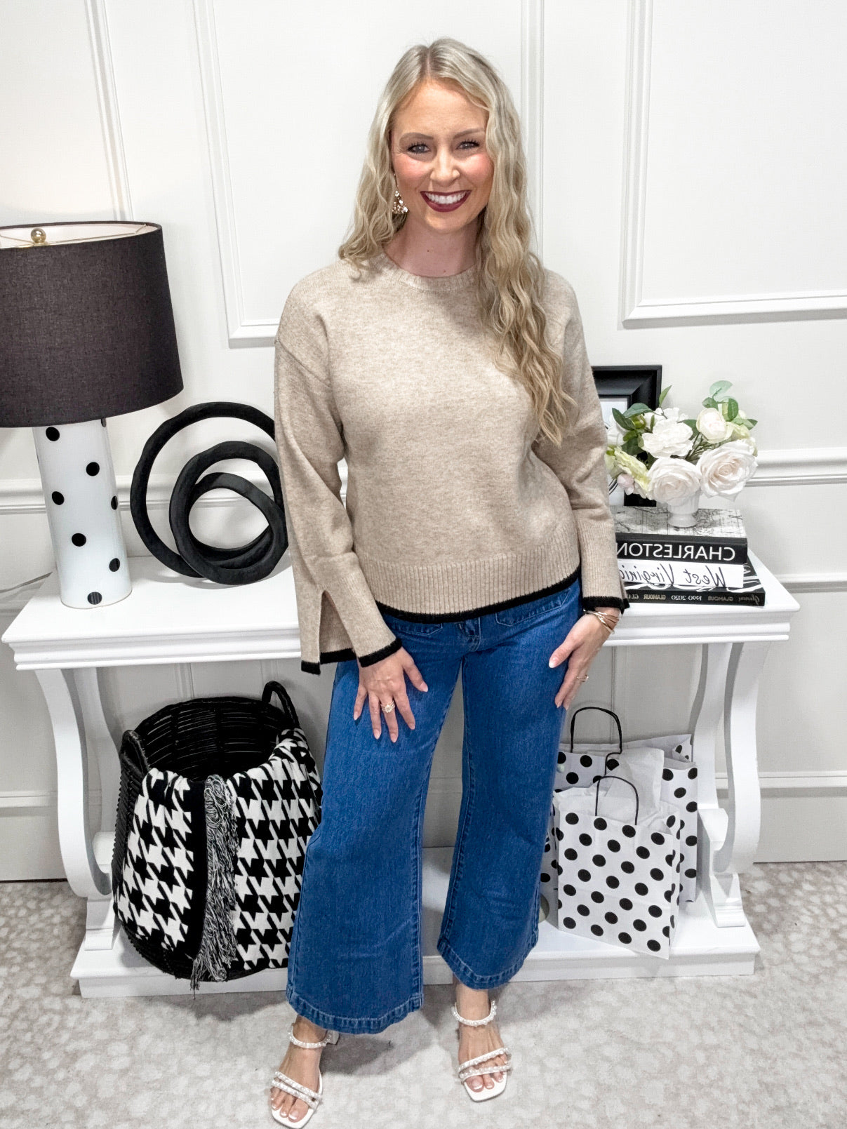 Cozy up in the Maya Sweater, featuring a warm camel hue and a playful wide cuff with a chic slit and black trim. The classic crew neck adds a timeless touch, making it perfect for layering or wearing solo. Effortlessly stylish and comfy, this sweater brings a fun twist to your everyday wardrobe.