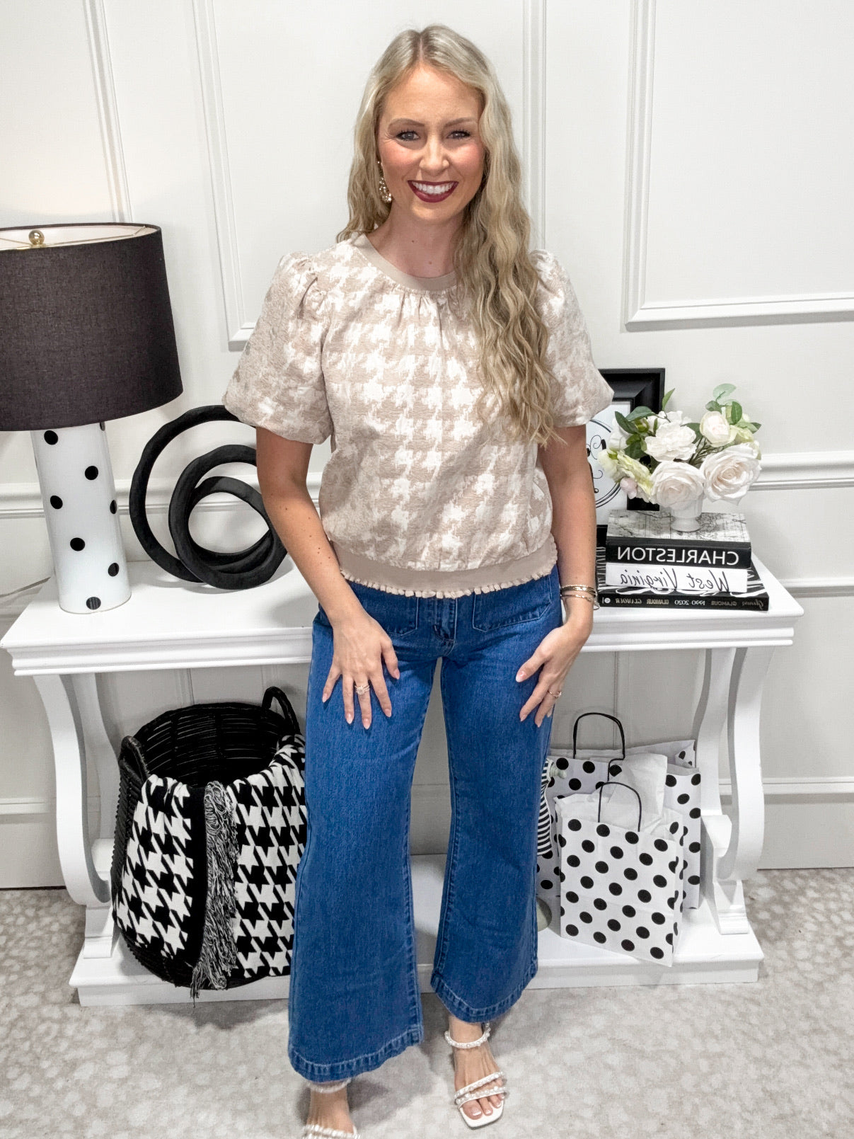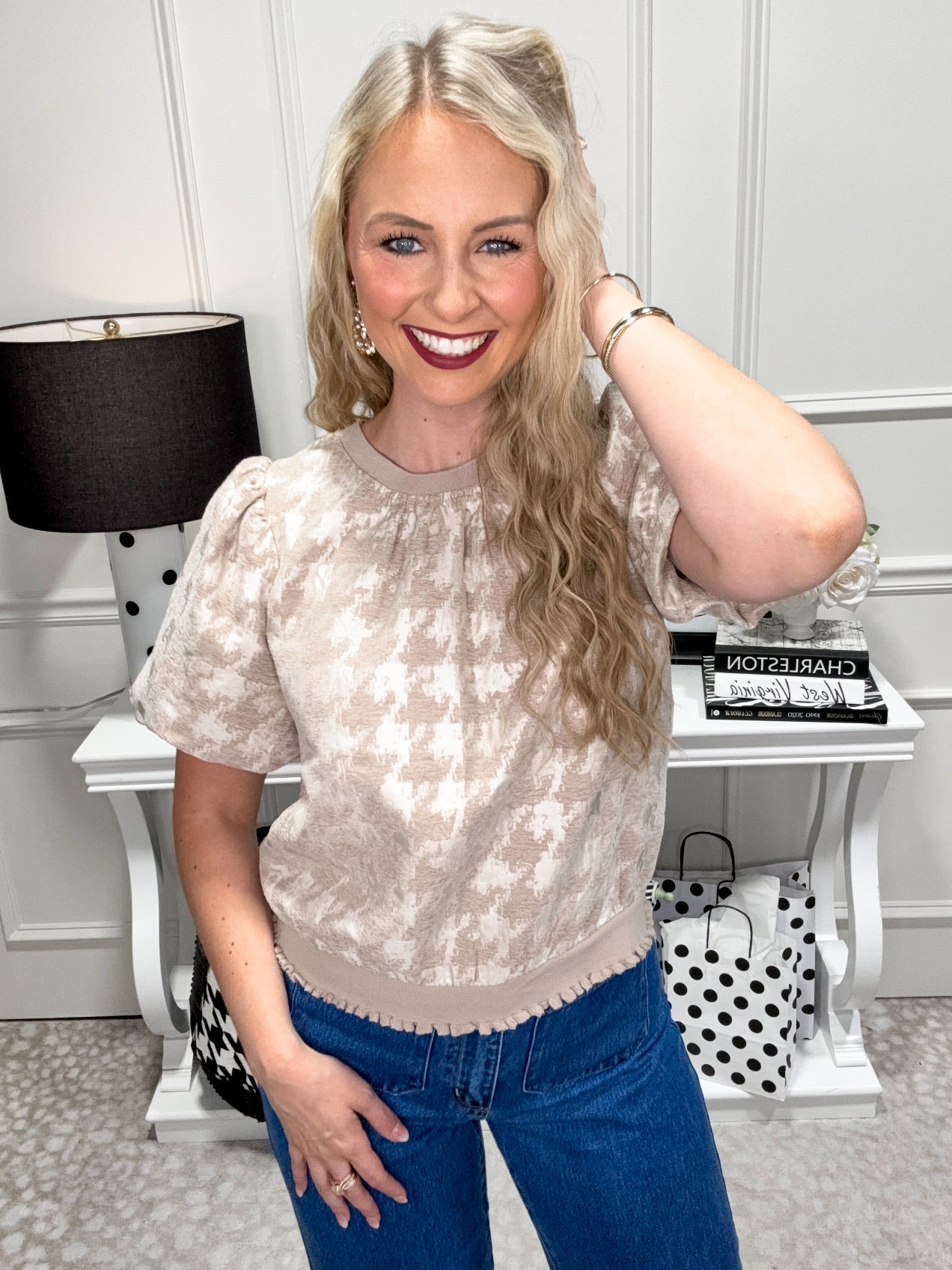 The Parker Top brings a playful twist to your wardrobe with its round neckline and charming short bubble sleeves. Crafted from luxurious houndstooth woven velvet, it offers a fun texture while feeling soft to the touch. The elasticized hem and neckline add comfort and a gentle stretch, making it perfect for all-day wear.