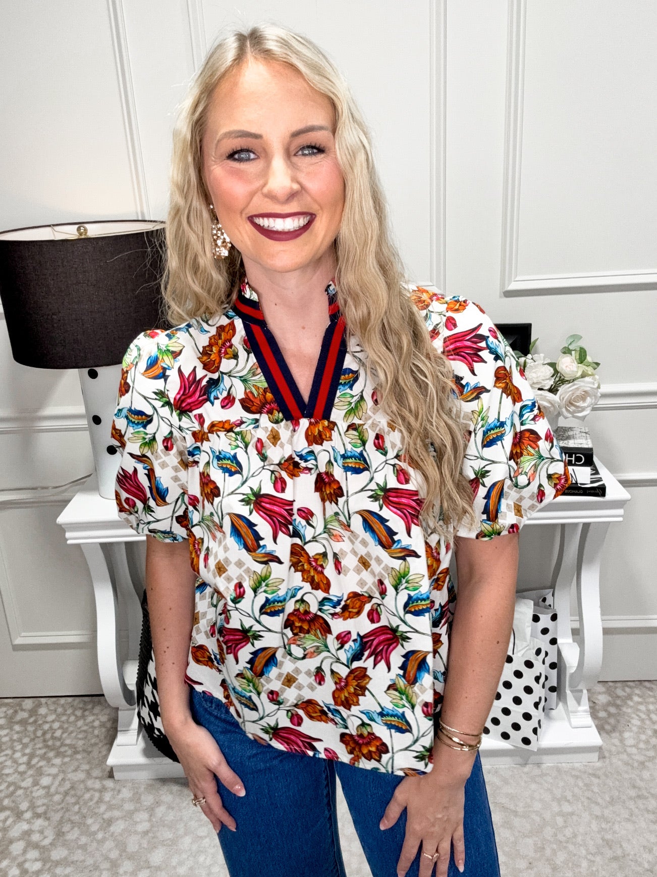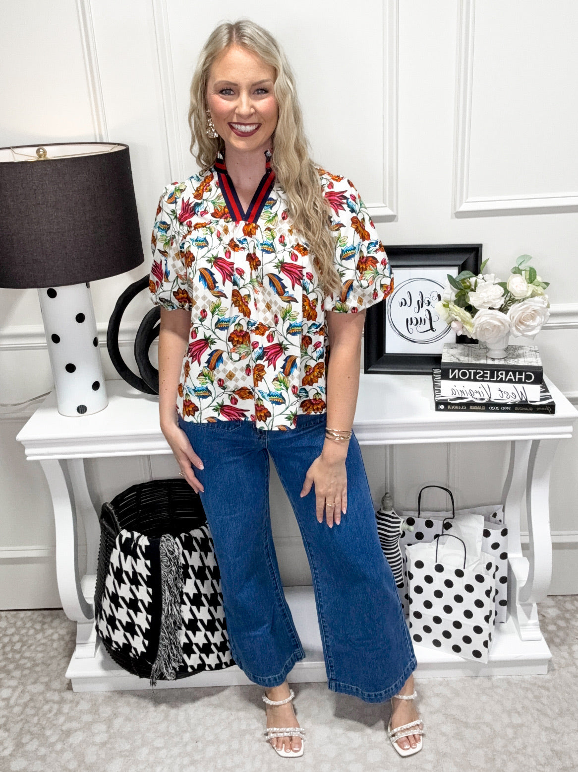 The Waverly Top brings a playful touch to your wardrobe with its charming V-neckline and short bubble sleeves. Crafted from a delightful floral woven fabric, it features an elastic stripe detail that adds a fun, flirty twist while ensuring a comfortable fit. Perfect for brightening up any day with a burst of pattern and personality.