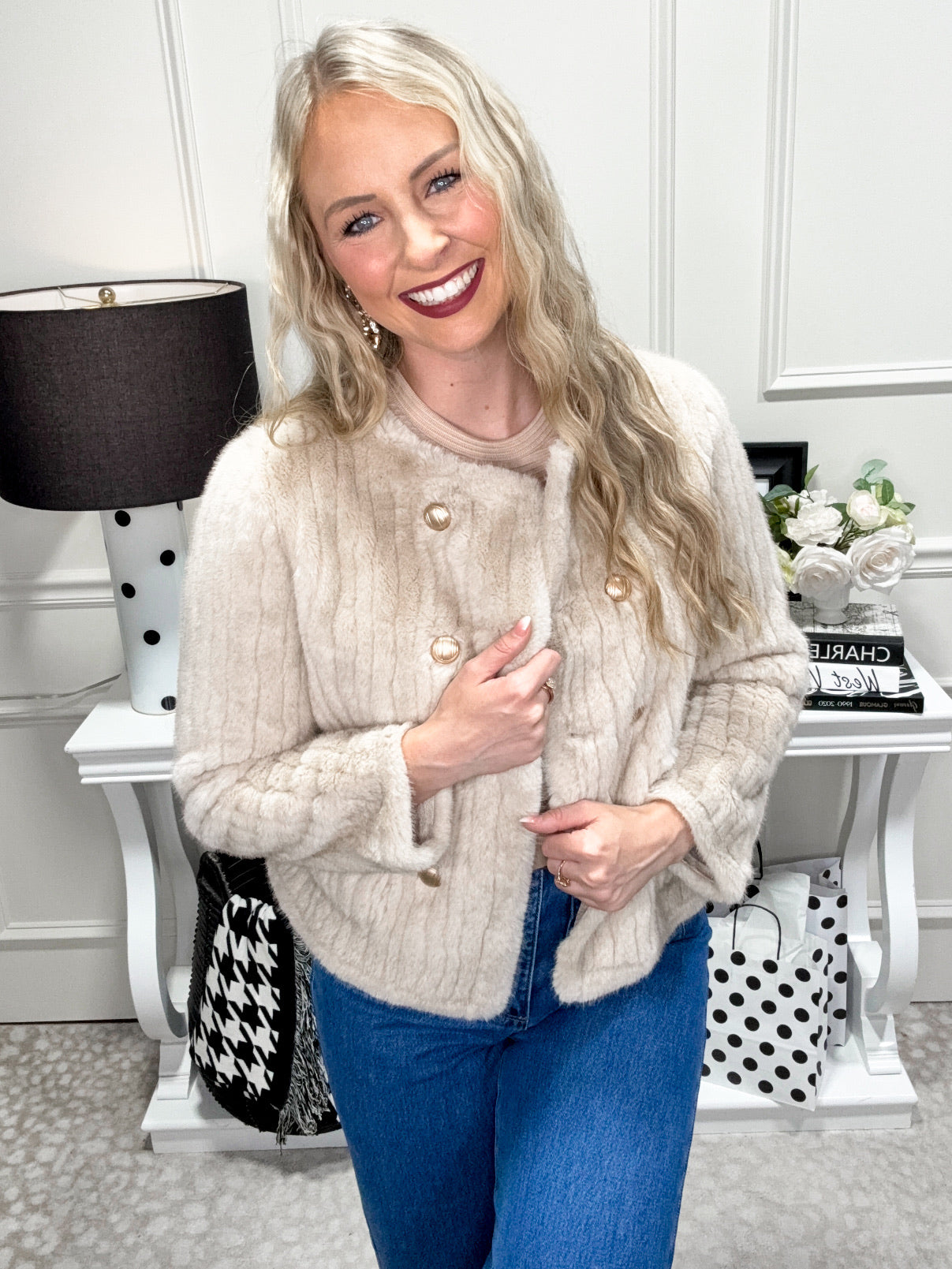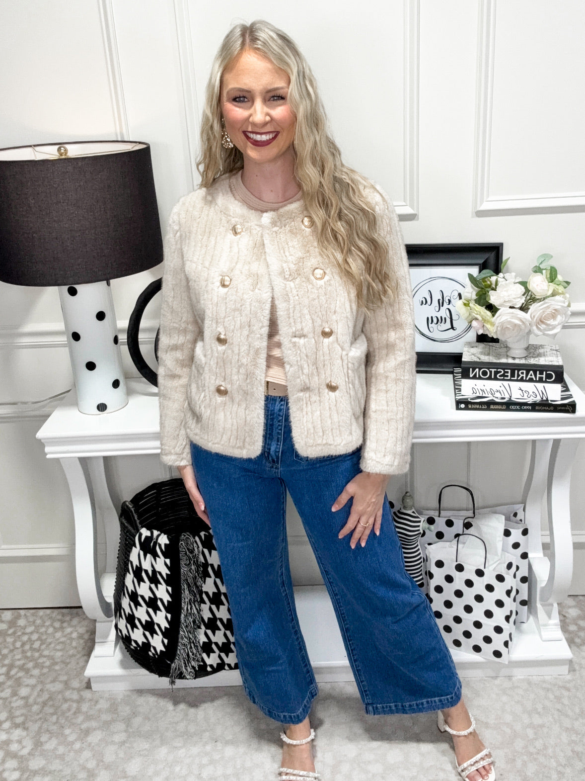 Step into style with the Virginia Jacket, crafted from a soft, woven fur-like fabric that feels as cozy as it looks. Its chic beige shade pairs perfectly with a double row of shiny gold buttons, adding a touch of glam to your outfit. The playful front open pickets make layering effortless, turning this jacket into your new go-to for cooler days with a wink of sophistication.