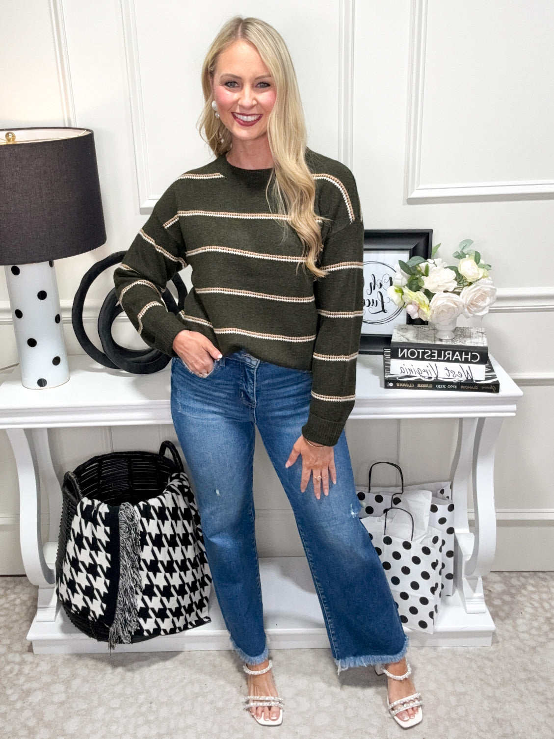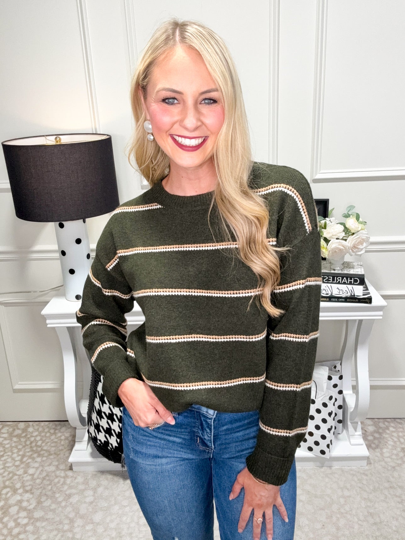 Cozy up in the Amelia Sweater, featuring charming olive stripes and a classic crewneck design. Perfect for adding a splash of fun and warmth to your casual outfits, it’s your go-to piece for chill days and cool nights. Embrace comfort with a playful twist!